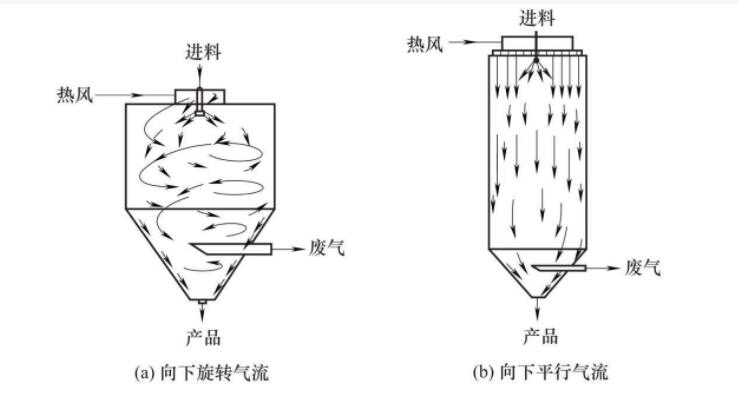 空氣經(jīng)過濾和加熱,進(jìn)入噴霧干燥機(jī)頂部空氣分配器,熱空氣呈螺旋狀平均地進(jìn)入干燥室。料液經(jīng)塔體頂部的高速離心霧化器,(旋轉(zhuǎn))噴霧成極細(xì)微的霧狀液珠,與熱空氣并流接觸在極短的時間內(nèi)可干燥為廢品。廢品連續(xù)地由干燥塔底部和旋風(fēng)別離器中輸出,廢氣由引風(fēng)機(jī)排空。