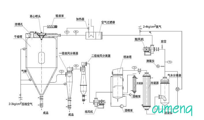 閉式循環(huán)噴霧干燥機(jī)系統(tǒng)由噴霧干燥機(jī)主機(jī)、帶空氣過(guò)濾器的加熱器、鼓風(fēng)機(jī)、水氣分離器、大小冷卻塔、噴淋塔、排風(fēng)機(jī)、一級(jí)旋風(fēng)分離器、二級(jí)旋風(fēng)分離器、泵、測(cè)氧儀以及管路與控制閥等組成。